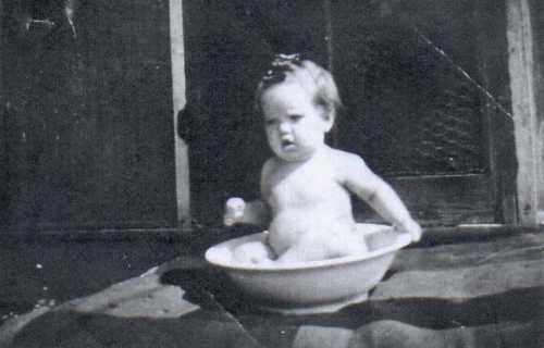 Dads sister Elsie was teaching school in Magna so she live(d) with us that school year before Richard was born + as her + I wiped the dished on the eventful night of May 10 I was put to bed by Daddy in the front room on a cot. I ask(ed) why and was told Dr. Owen was going to bring me a new baby to love. Here he came with a huge bag he being shot (short?) it really seemed large he didnt even speak to me but rushed through the swing doors to the kitchen. I was told to stay there and not come out. It seemed like a long time when I ventured out only to be stop(ped) at the door + stern(ly) told to go back. Finally I heard a baby cry no way was I going to stay put. I watch into the kitchen to see Mrs. Justin (How did she get involved(?)) with foot on oven door large wash basin on back of stove holding up what seemed to me a large red baby screaming to the top of his lungs. (He weigh(ed) 10 lbs) I was stun(n)ed. They told me it was a brother and go back to bed which I did Nexted morning Daddy took me to the back porch to tell Baxters who live(d) next door on the N. of us + where out picking their strawberries He had a son.
